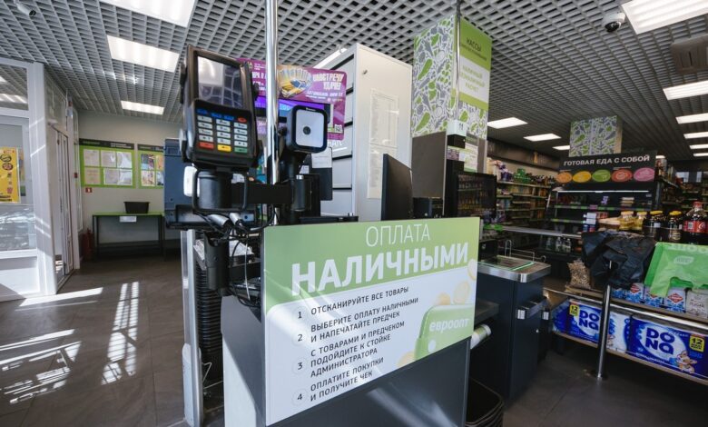 Покупателям доступно пять касс самообслуживания со сканерами. Рассчитаться можно банковской картой, смартфоном или умными часами, но принимают и наличные. В последнем случае механика такая: сканируете товары, выбираете на экране оплату наличными и получаете предчек. С ним нужно подойти к стойке администратора, который пересчитает купюры.