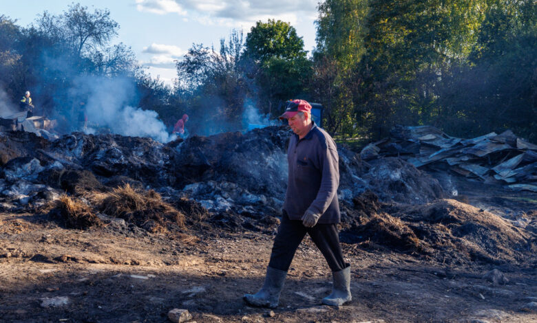 Татьяна рассказывает, что только на четвертые сутки им разрешили вывезти останки погибших животных и разбирать то, что осталось от некогда большого хозяйства. Сейчас вокруг остатки тлеющей крыши и сена. Но самое страшное — внутри сарая: повсюду лежат обугленные тела животных.