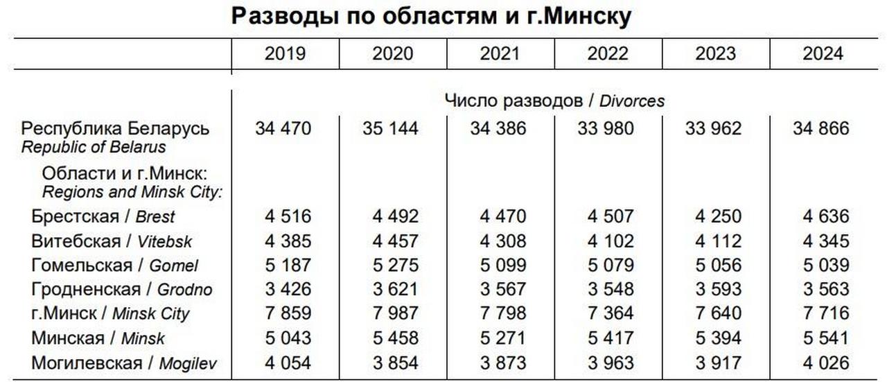 Что касается расторжения браков, то и здесь в 2024 году первенствует столица (7716 разводов), за ней Минская (5541) и Брестская (4636) области. Если же посмотреть на данные 2019 года, то цифры в этих регионах были схожими: 7859, 5043 и 4516 соответственно.
