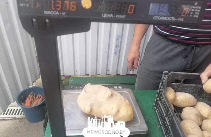 На сегодня это не все. Выяснилось, что хорошо растут в этом году не только помидоры. Вот такую картофелину привезли на продажу в Гродно из Озер.
