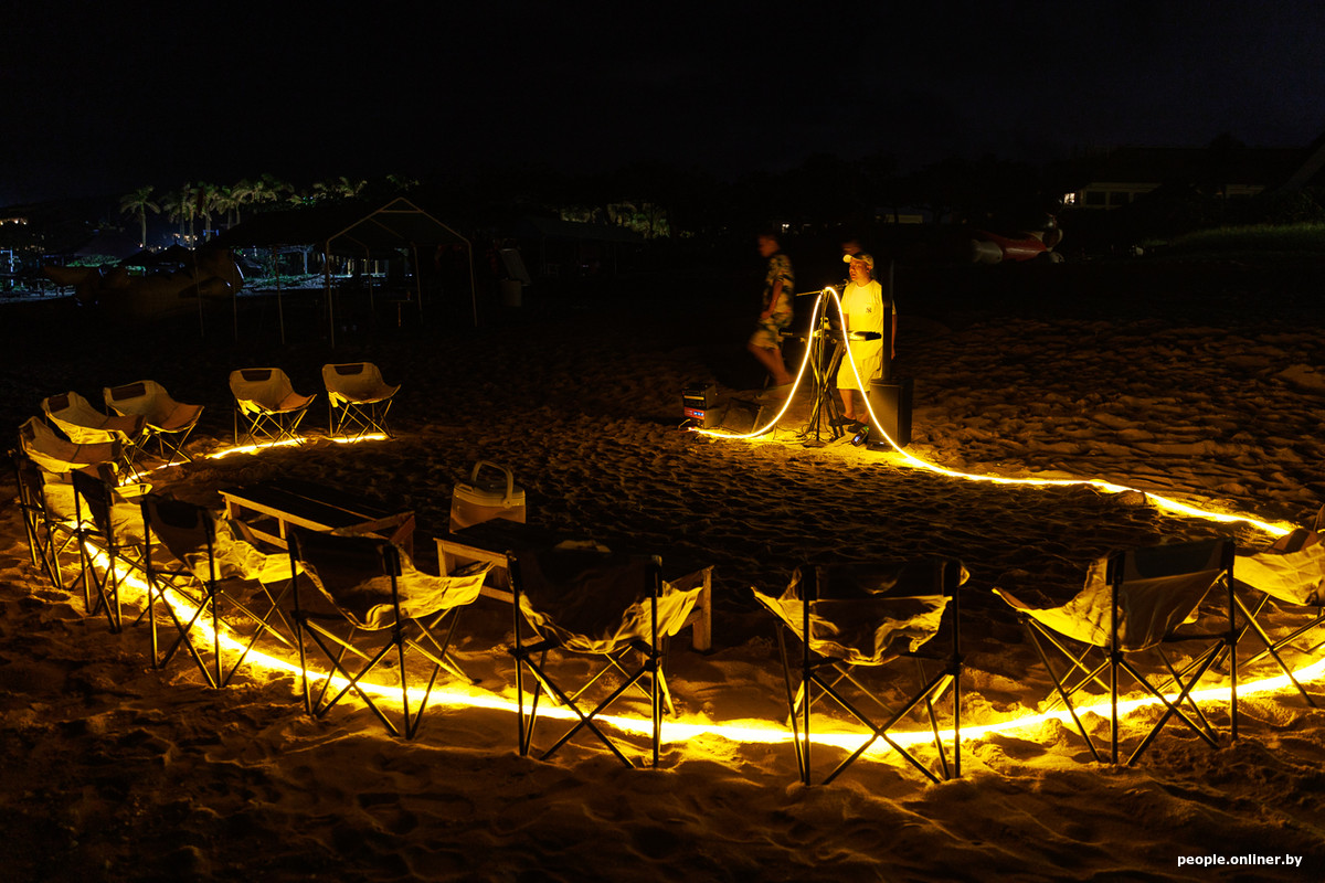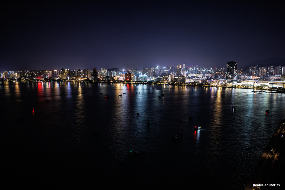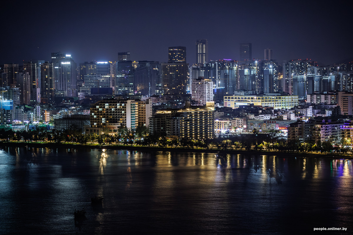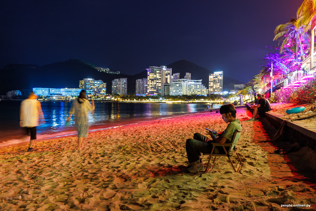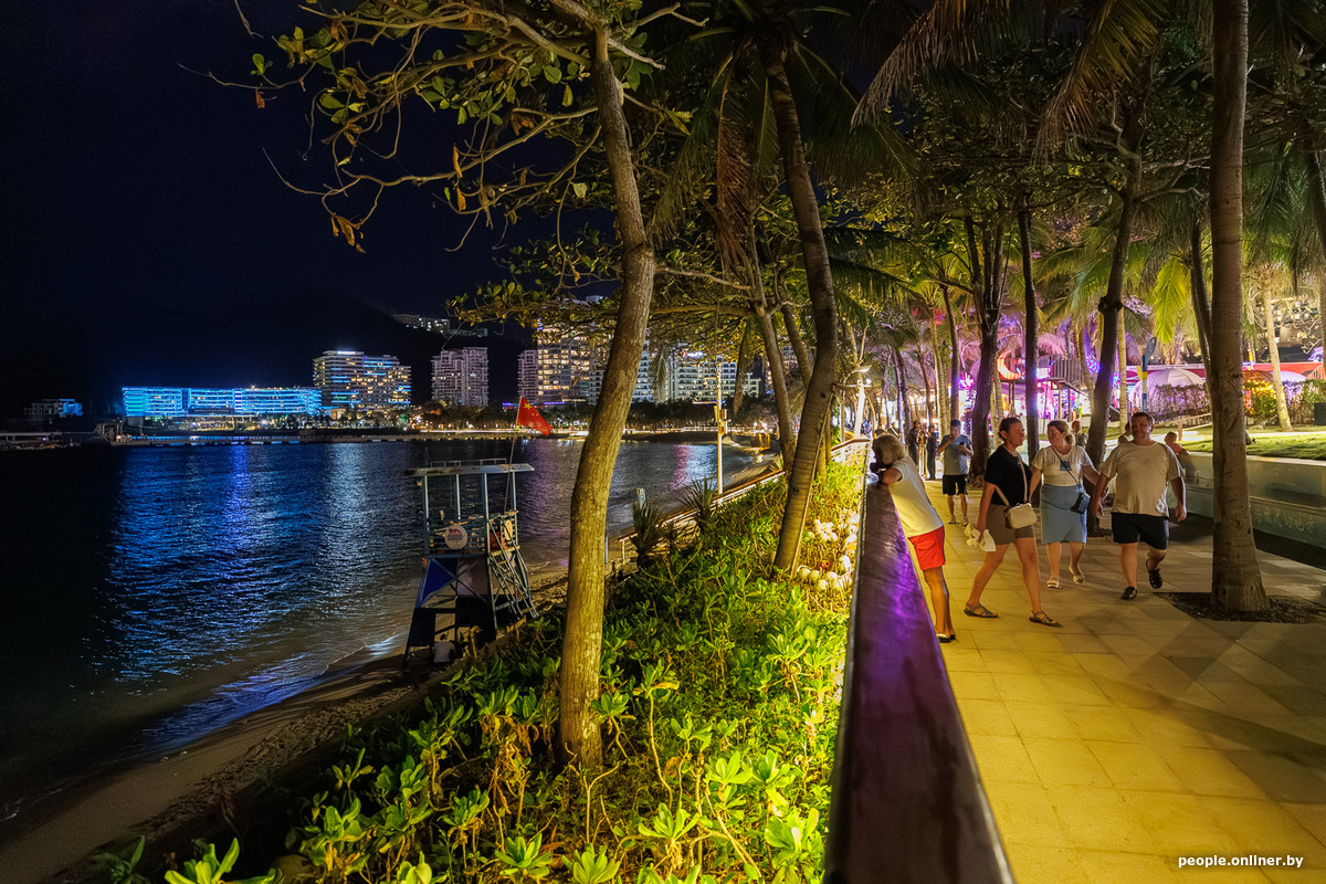 В Санья Бэй самые красивые закаты (в остальных бухтах солнце прячется за холмы), но по вечерам может быть скучновато. Тусовочной улицы с барами вдоль моря нет, туристы едут за этим в соседнюю бухту Дадунхай или на рынки со стритфудом. Про китайскую еду у нас будет отдельный выпуск, а пока покажем еще немного вечерней Саньи: