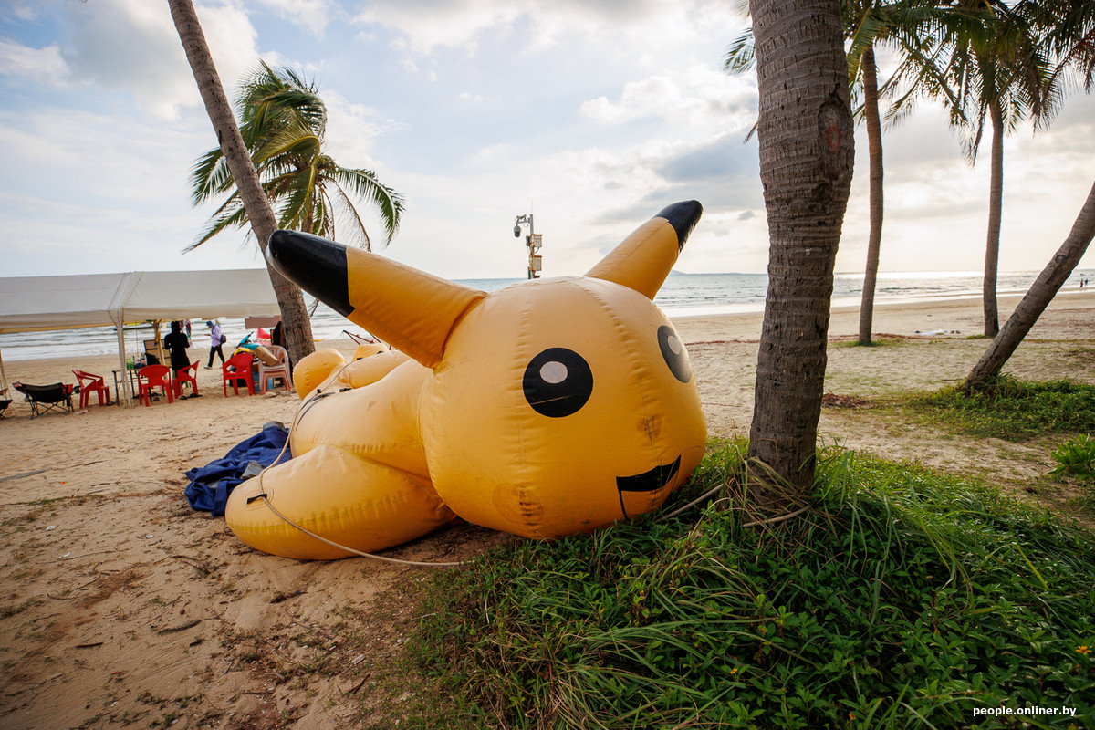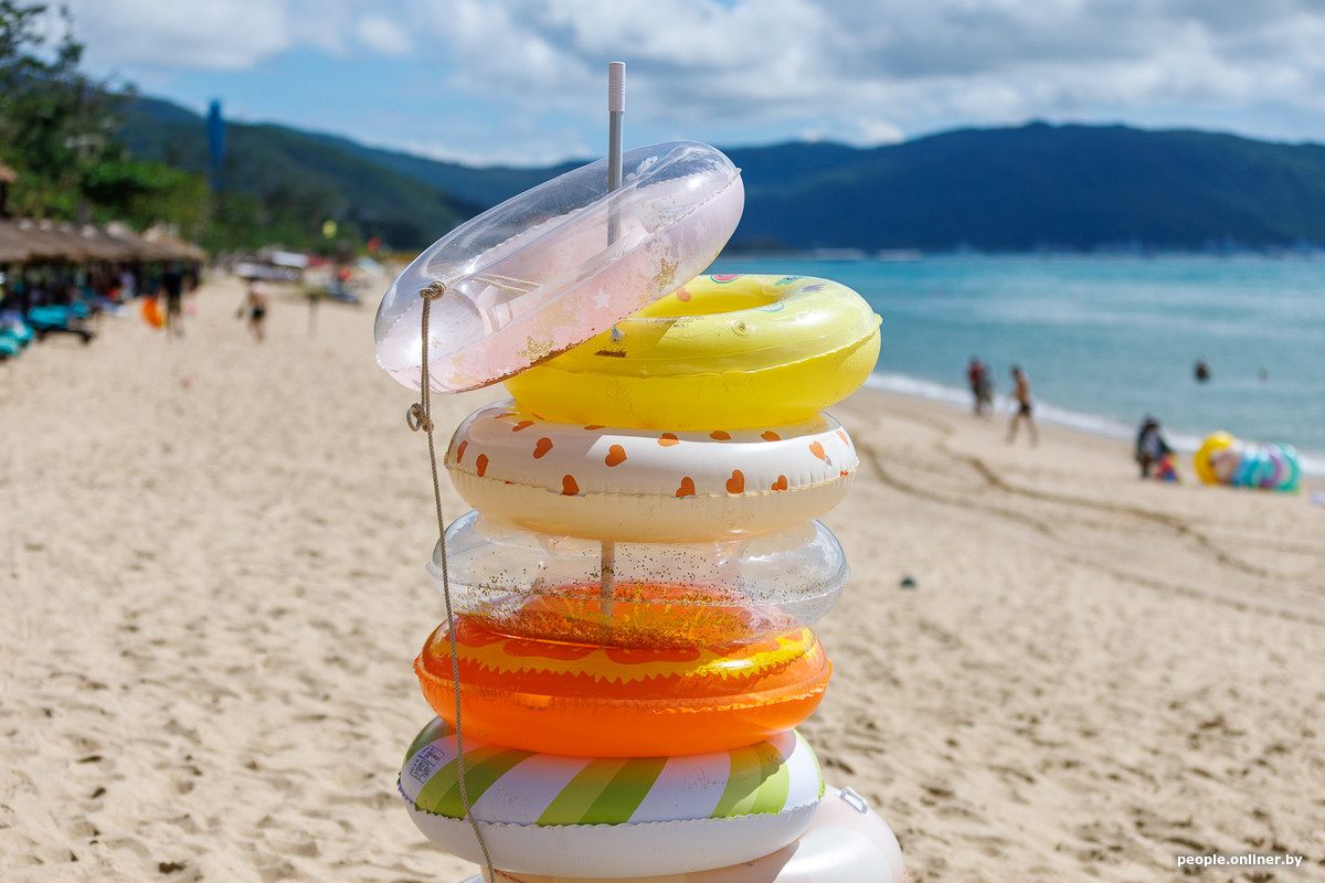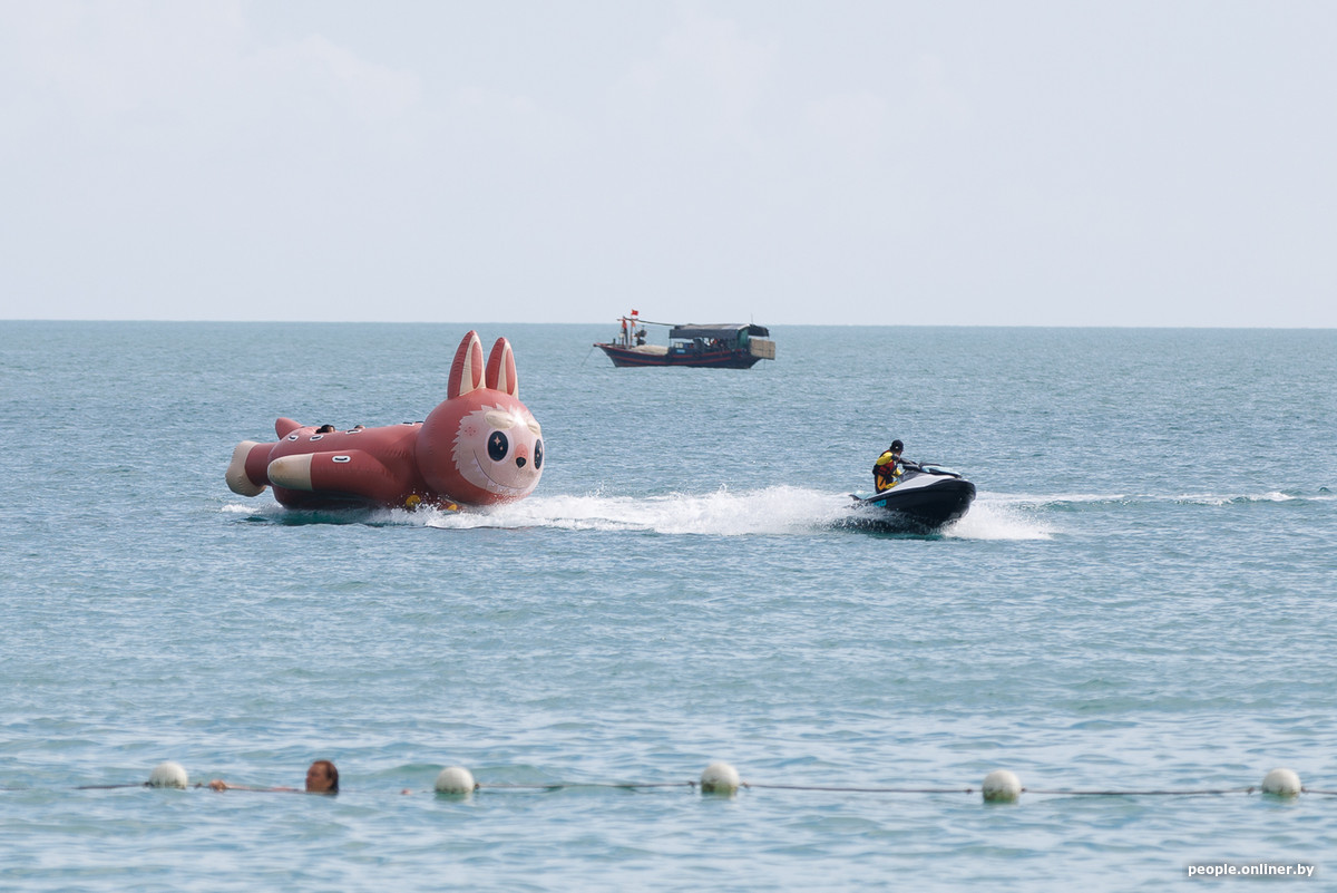 На пляже есть платный душ, туалеты — вся необходимая инфраструктура. Вдоль берега линия с кафешками и барами — покупаешь любой напиток и бесплатно занимаешь лежак. Можно взять напрокат гидроцикл или прокатиться на огромной надувной лабубу. Китайцы не стесняются радовать своего «внутреннего ребенка» — по поводу и без.