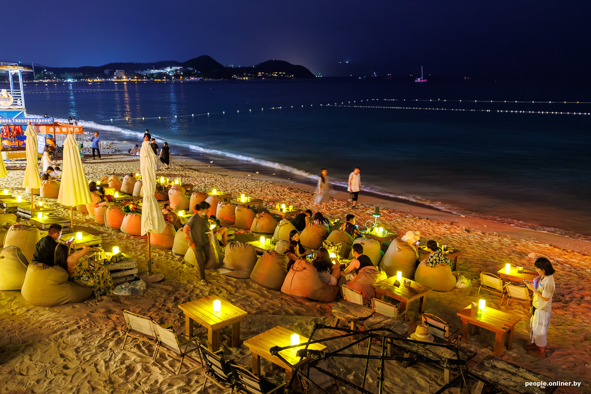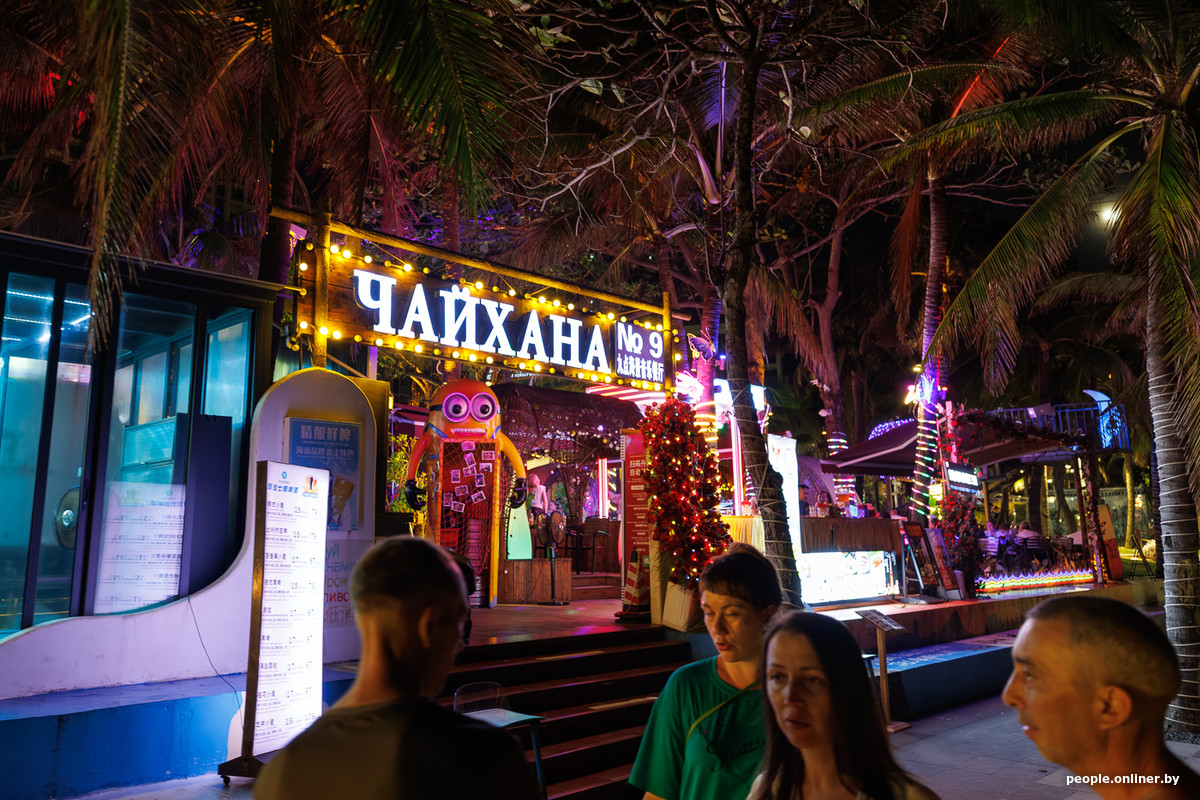 По вечерам в Дадунхае скучно не бывает. Набережная загорается яркими красками, из колонок звучит громкая музыка. По обилию вывесок и картинок с меню на русском несложно сделать вывод, на кого ориентирована эта бухта.