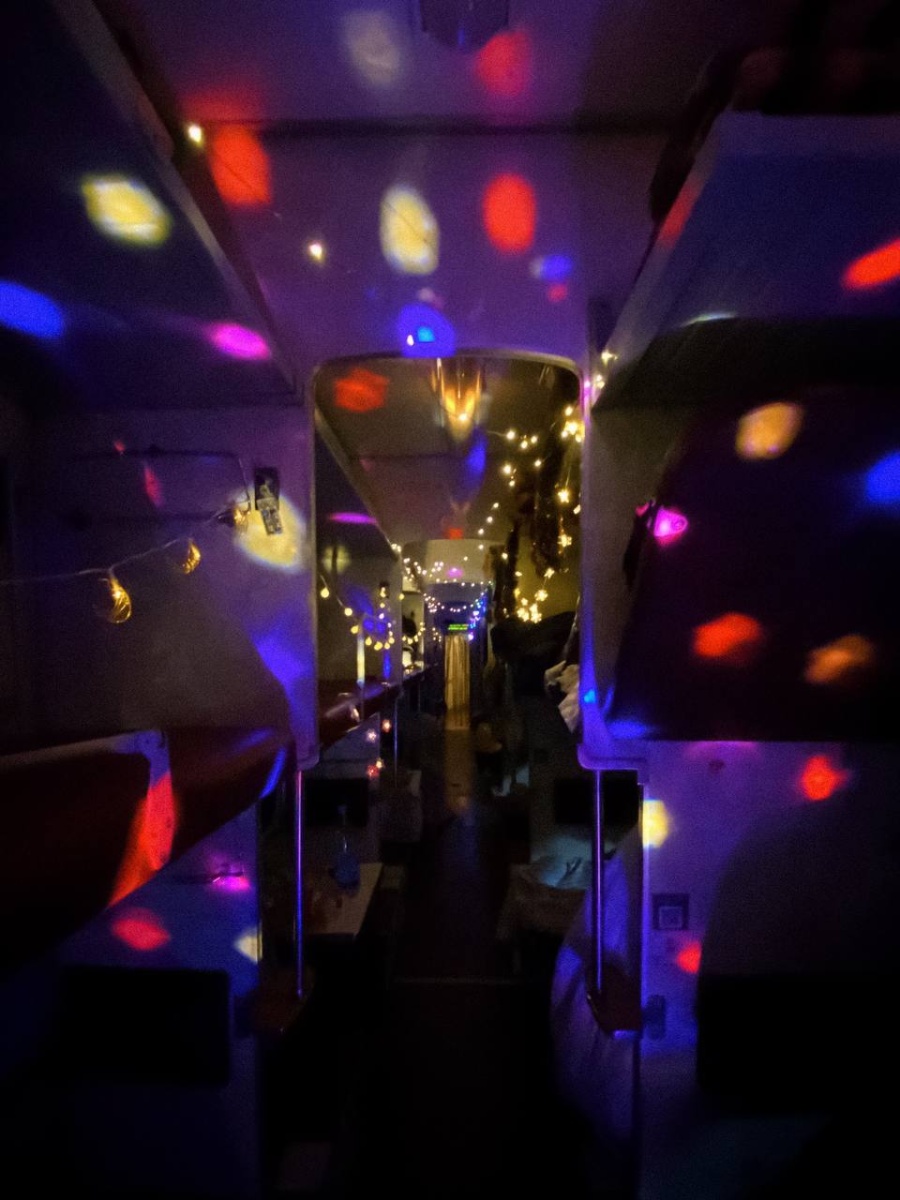 Стоянка поезда в Минске длилась около 30 минут – этого хватило, чтобы украсить весь вагон и накрыть праздничный стол. Каждый принес что-то свое: гирлянды, мишуру, салаты и закуски.