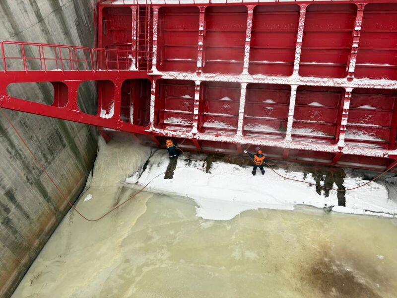 Чтобы исключить повреждения затворов и других элементов в результате теплового расширения льдаперед затворами специально выпилили лед и открыли полынью на протяжении всей длины водосливной плотины.