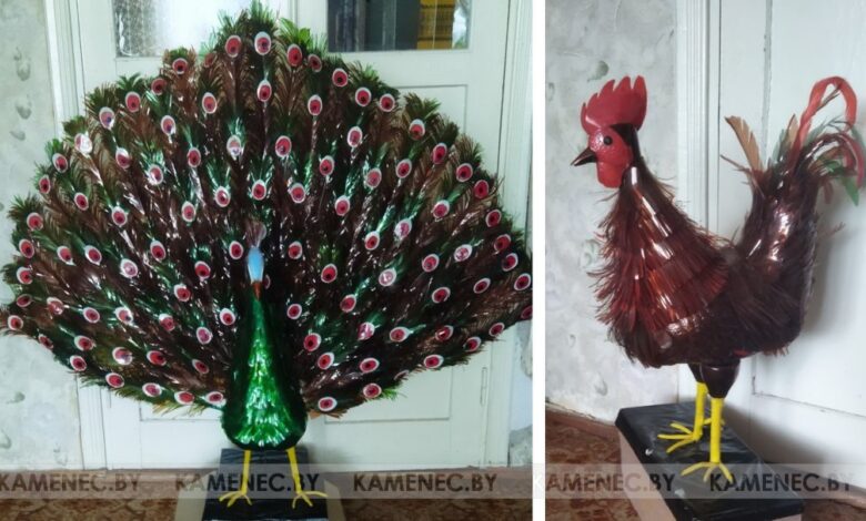Пластик Валентина Васильевна использует только цветной. Лебеди – это бутылки из-под кефира. Петух и павлин – тара из-под пива. Как-то сын принес ей пластиковые бутылки синего и красного цвета – радости не было предела. Основу птичьего туловища составляют 5-литровые бутыли. Когда-то Валентина Васильевна попыталась посчитать, сколько «кефирных» бутылок пошло на изготовление лебедя – и сбилась со счета. Что-то очень много. Из инструментов – одни маникюрные ножницы. Только ими можно нарезать пластик такими тоненькими полосочками, что он точь-в-точь становится похожим на птичье перо…