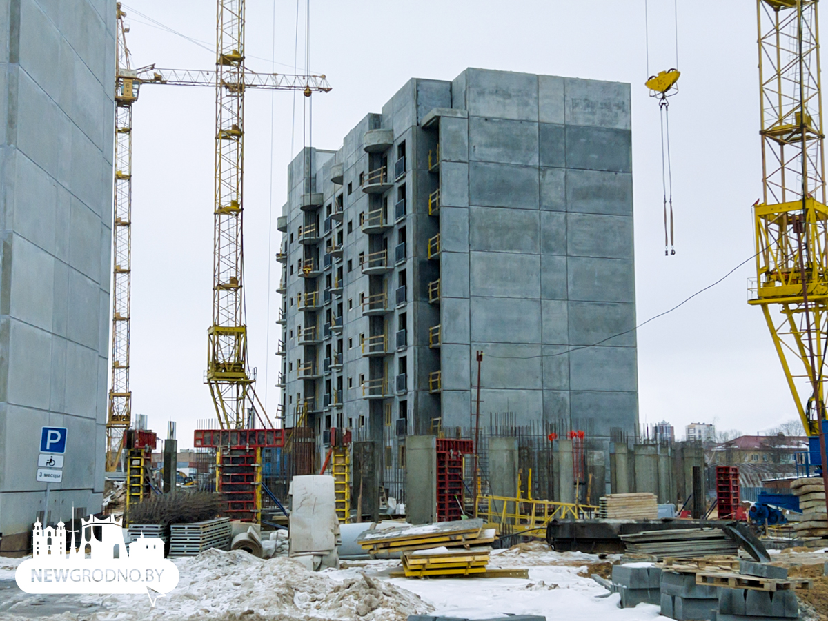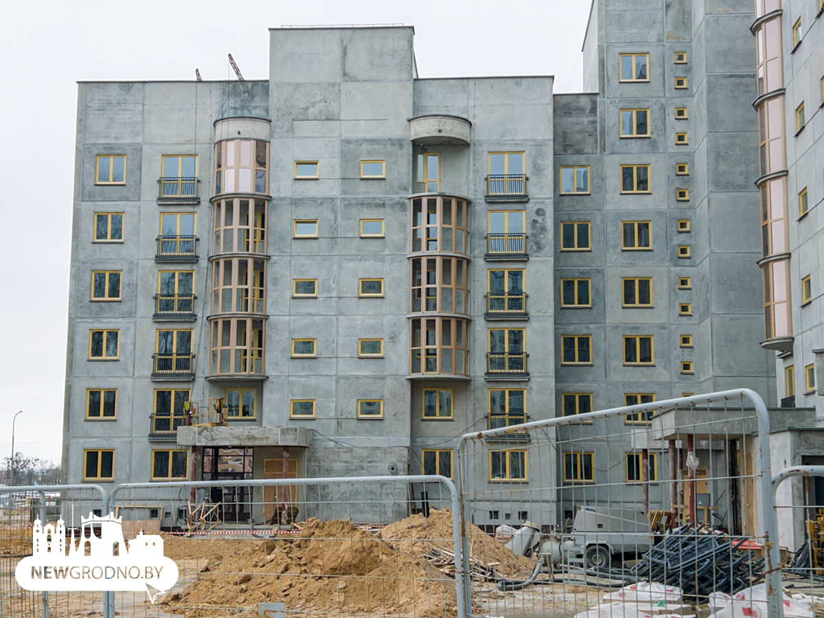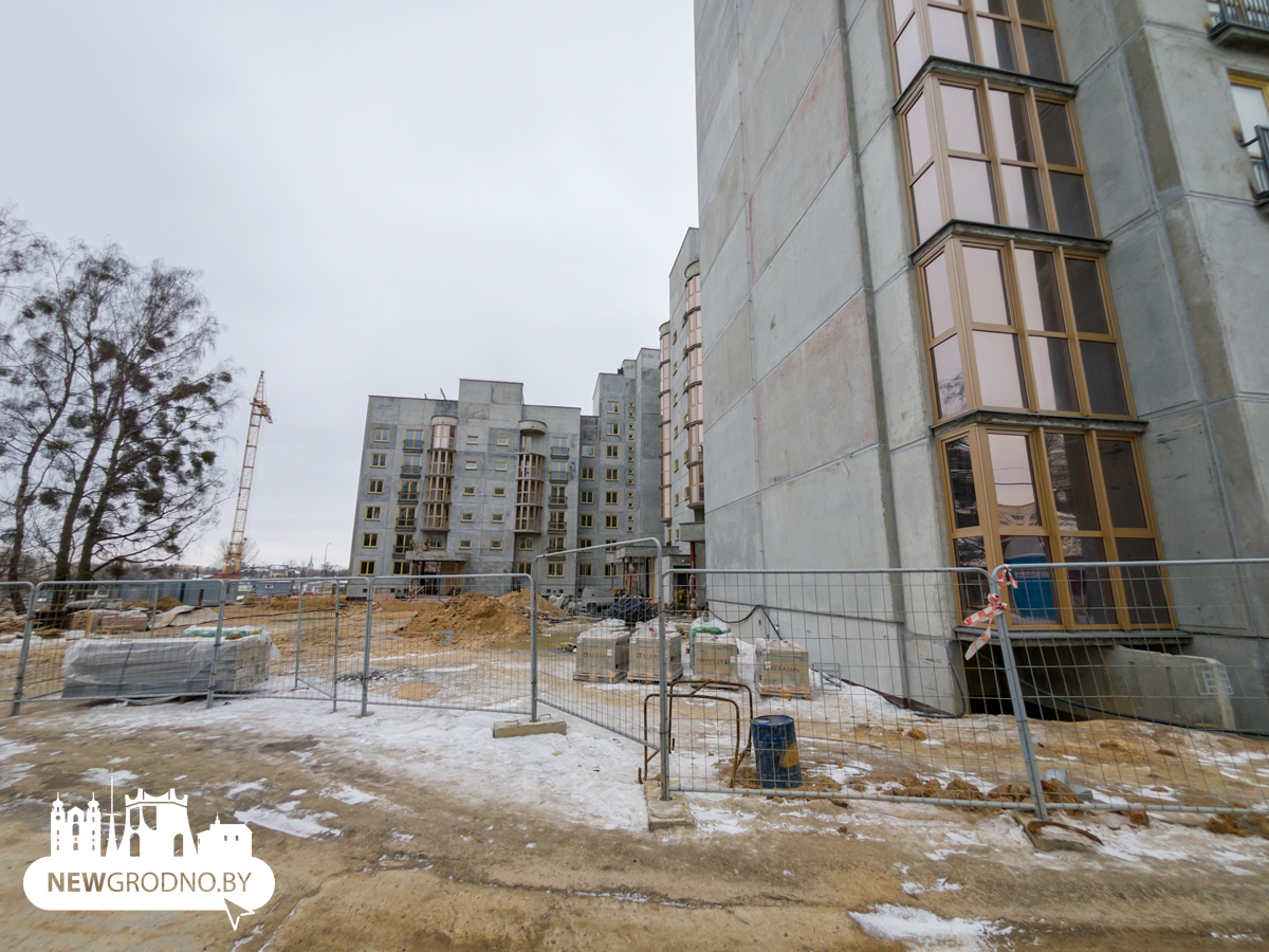 Первые из них планируют сдать уже буквально через несколько месяцев. Сейчас можно оценить, как будут выглядеть эти дома. Это стандартные «панельки» от «Гродножилстрой»: в некоторых комнатах есть окна «в пол», также панорамное остекленение реализовано на лоджиях. Основной же стиль зданию задаст наружная отделка: фасадами, видимо, займутся в теплое время года.