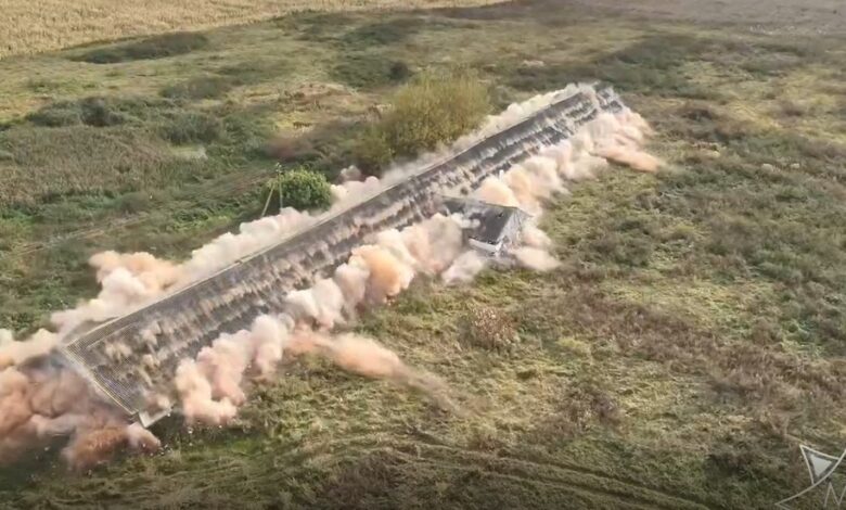 Процесс сняли с высоты, и кадры получились впечатляющими: точная работа специалистов, мощный взрыв и эффектное разрушение. Настоящее мастерство в действии.