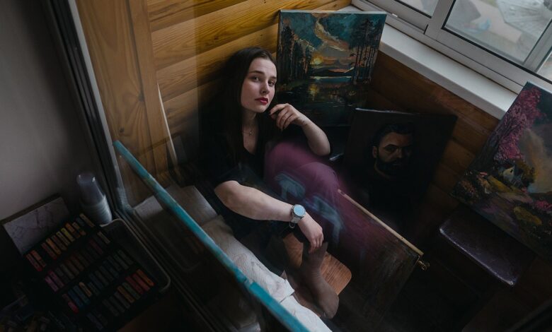Встречаемся с Настей у нее дома. Здесь — на кухне и балконе — она обустроила для себя небольшую мастерскую. Еще во время обсуждения интервью художница предложила нарисовать нашу журналистку в процессе беседы. Поэтому мы не только болтаем, но и подсматриваем за ее работой. Обычно на написание портрета уходит около пяти-шести часов. Но у нас ускоренная, а поэтому упрощенная версия. Настя заранее делает набросок.