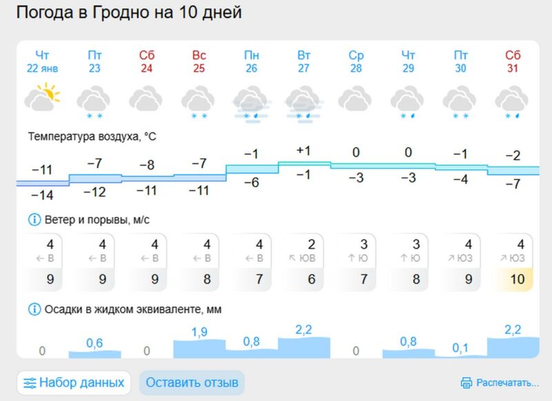 «В ближайшее время на погодной арене Беларуси назревают перестройки… До конца текущей недели под влиянием области повышенного атмосферного давления, сформированной в холодной воздушной массе, в Беларуси сохранится морозная с температурными контрастами погода», — пояснили синоптики. По их прогнозу, ночью ожидается от –6°C на юго-западе до –25°C на севере, днём — от –1°C до –17°C соответственно. В конце недели местами возможен снег и мокрый снег.