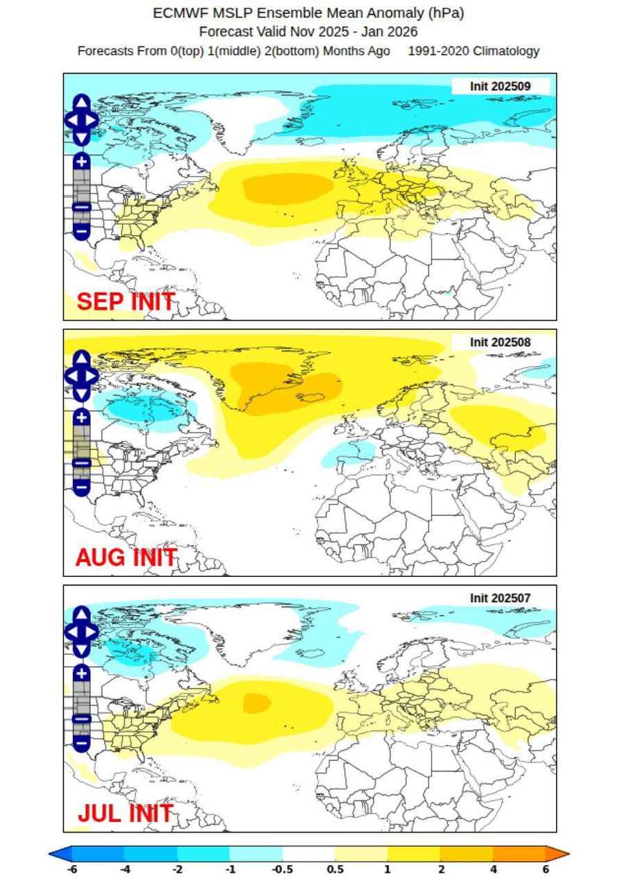 Так, телеграм-канал о погоде в Беларуси @nadvorie показал сезонный прогноз ECMWF на ноябрь–январь 2025-2026. А именно — расчеты, сделанные в июле, августе и сентябре.