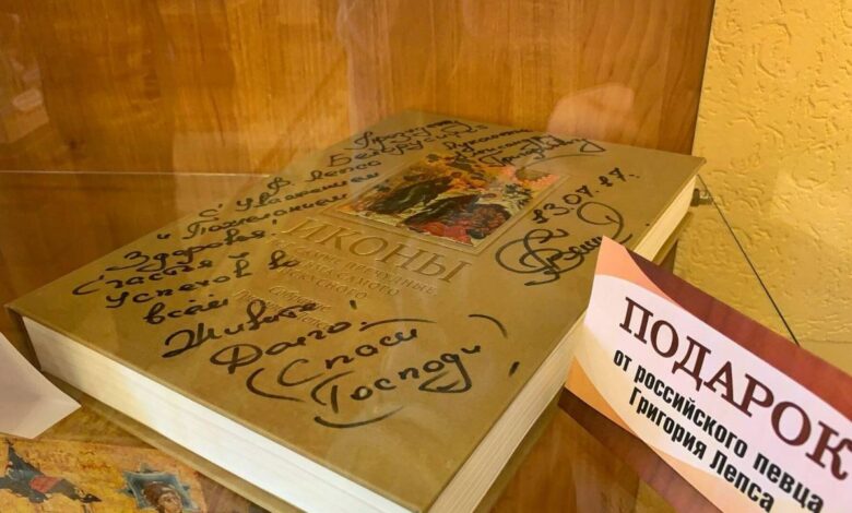 Кроме того, на витрине, посвященной религиозной тематике, выделяется подарок певца, композитора, народного артиста РФ Григория Лепса – книга с фотографиями икон из его собственной коллекции. Дарственную надпись с пожеланием успеха и долгих лет жизни певец решил оставить прямо на обложке.