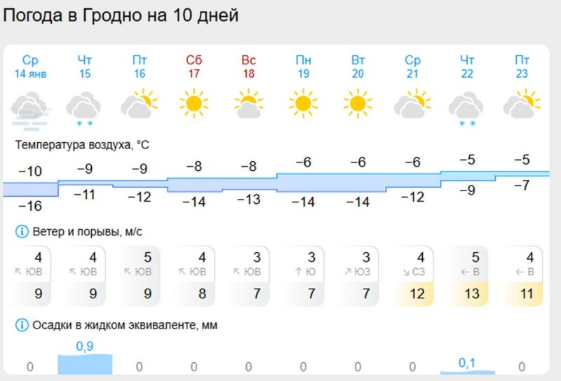 Особенно холодной в ближайшие дни обещает быть ночь с 15 на 16 января. В Витебской и Могилевской областях ожидается похолодание до -25…-29°С, на Минщине и Гомельщине – до -25…-28°С.