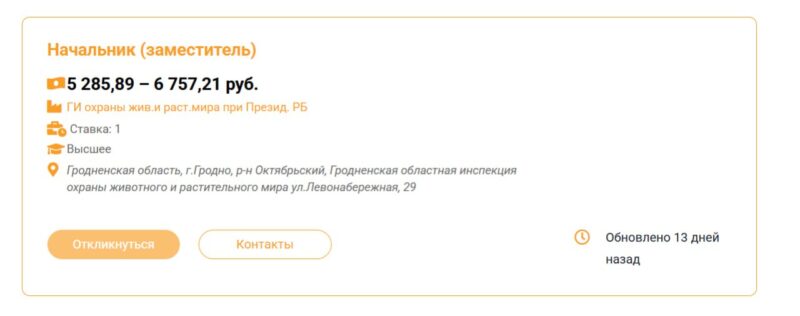 Чуть более 5000 рублей предлагают и начальнику (заместителю) Гродненской областной инспекции охраны животного и растительного мира. Соискатель должен иметь за плечами службу в армии и образование в сфере лесного хозяйства, экологии или биологии. Есть требования и по состоянию здоровья: работа связана с правом ношения оружия.