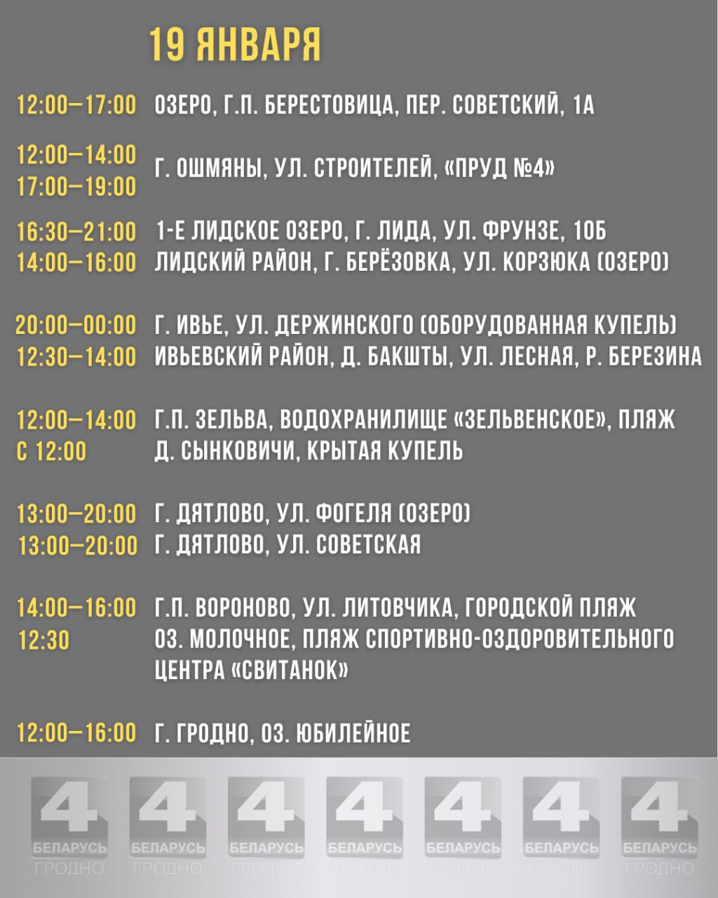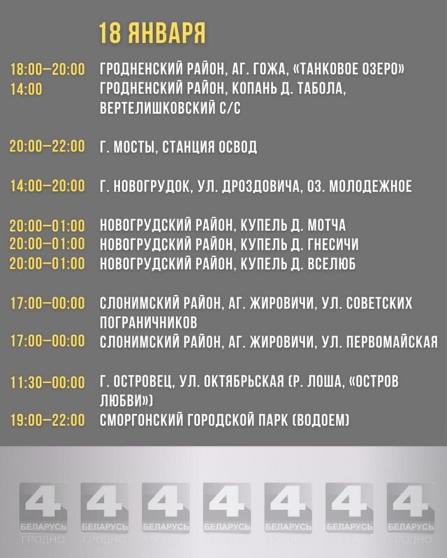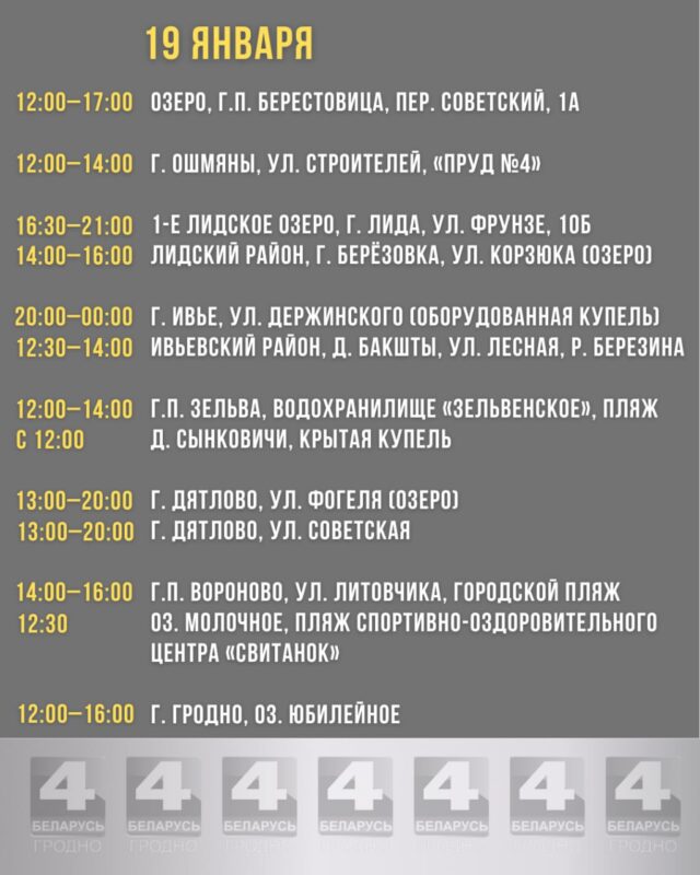 В Гродно основным местом для совершения обряда будет Юбилейное озеро. Торжественное мероприятие запланировано на 19 января: в полдень начнётся молебен с освящением воды, после чего с 12:00 до 16:00 будет открыт доступ к оборудованной проруби для всех желающих совершить омовение.