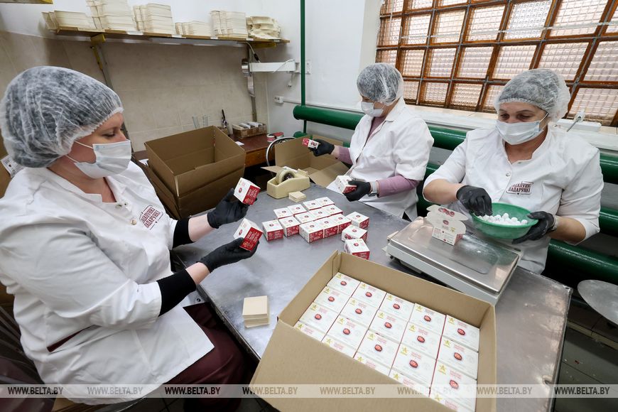 «Получаем массу – воздушную как пух. Нанесение сахарной пудры на изделие происходит на закаточном столе. Но это еще не готовый продукт, а полуфабрикат. Если в этот момент взять драже в руки, пудра сразу рассыпется. Поэтому есть еще завершающая стадия – сушка в шкафах. Только после этого происходит фасовка», – делится секретом руководитель.
