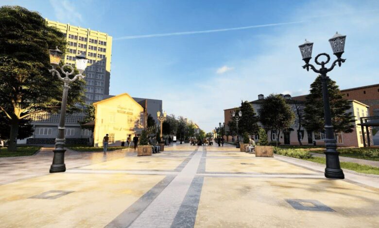 Утверждённый проект благоустройства предусматривает создание комфортной зоны отдыха на пешеходной улице, где установят 24 литых фонаря, а также скамейки и столики для горожан. Новые скамейки появятся и на площади возле детской школы искусств.