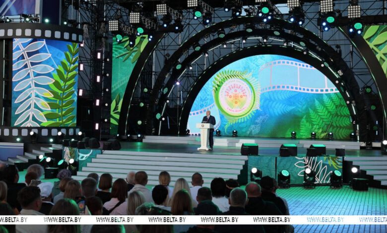 «Рад приветствовать вас в Александрии — одном из самых красивых и уютных уголков нашей Беларуси. Что значит для меня эта земля, люди, живущие на ней, — давно не секрет. Здесь вы отдыхаете душой, точно так, как я. И говорить на этой сцене всегда хочется о том, что близко и понятно каждому из нас. Об истоках, о культуре, о наших традициях. Вы знаете, как трепетно и внимательно мое отношение к нашему культурному наследию. Это основа основ. Это наша душа. Без него нет истории, нет государственности, и нас тоже нет — нет народа», — сказал глава государства.