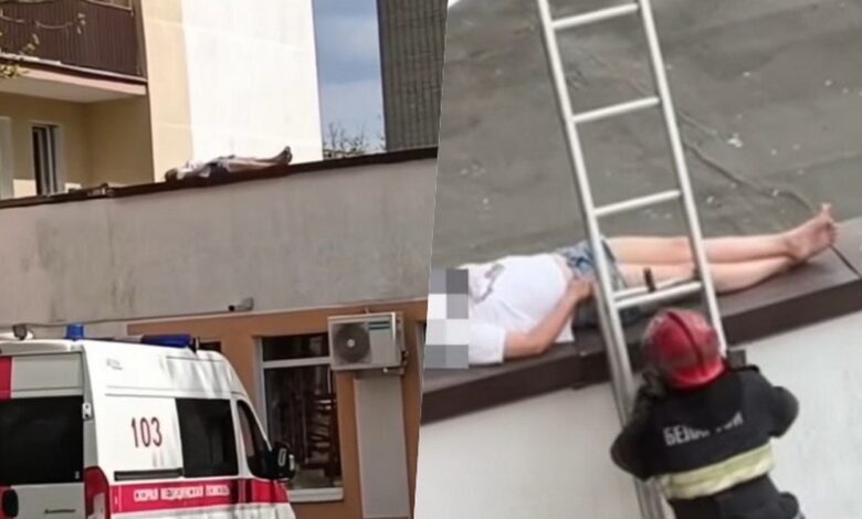 Сотрудники МЧС приставили к козырьку лестницу и отправились будить отдыхающую. Бдительные горожане на всякий случай вызвали еще и скорую помощь. Но она не понадобилась: девушка просто спала.