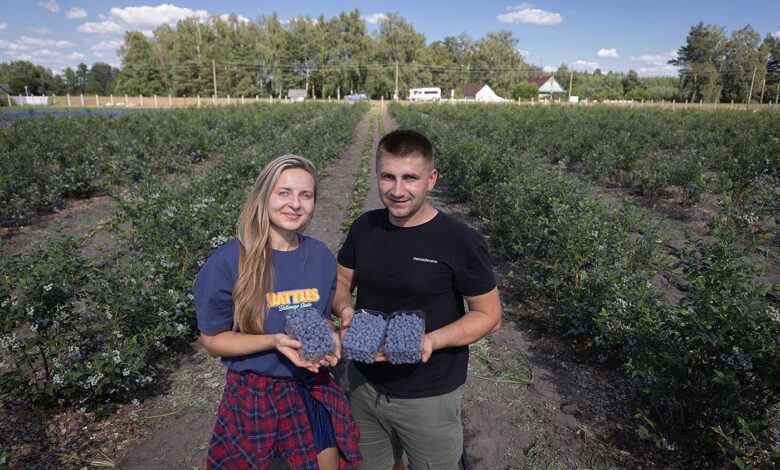 С Юлей и Андреем мы встречаемся на ягодном поле в деревне Галый Бор, что под Лунинцем. Ей 27, ему 28. Через дорогу живут дедушка и бабушка Андрея — за ними, собственно, и числится поле. Здесь порядка 1800 кустов голубики сорта «Блюкроп», которые занимают 60 соток. Она еще зеленая, спелые ягодки в меньшинстве. Между рядами кустов растет клубника, которая прописалась тут ненадолго: это рассада, которую по осени перенесут в теплицы.