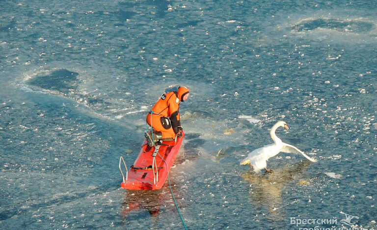 Лебедя заметили ранним утром на Брестском гребном канале. Одним крылом птица примерзла ко льду и не могла освободиться. На помощь пришли спасатели.