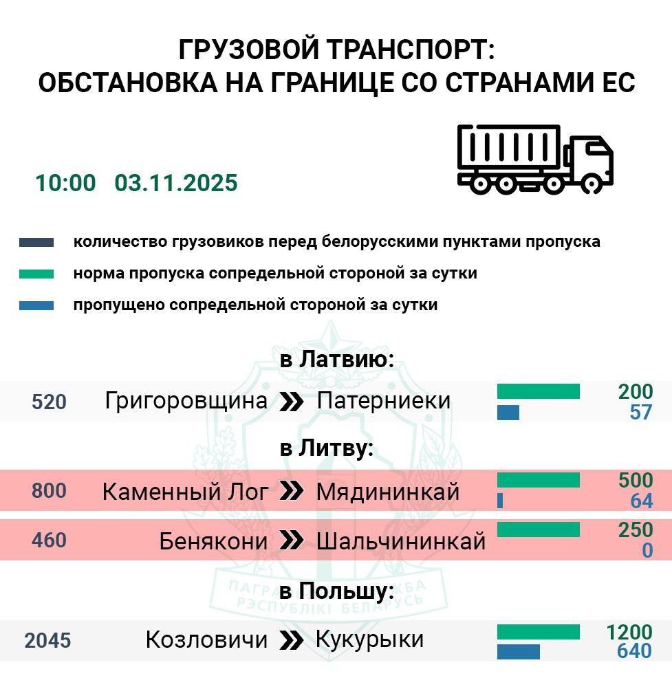 — Самый загруженный маршрут для фур на въезд в Евросоюз проходит через погранпереход «Кукурыки» («Козловичи») — в очереди 2045 единиц. За выходные сопредельная сторона пропустила 57% грузовых автомобилей от нормы, — рассказали в ГПК. — Контролирующие службы латвийского пункта пропуска «Патерниеки» («Григоровщина») оформили 37% авто от нормы. Въезда в Латвию ожидают 520 грузовиков.