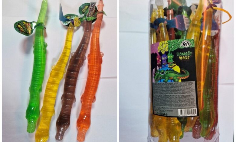Гомельская областная инспекция Госстандарта информирует о выявлении в розничной торговой сети лакомства, не отвечающего установленным требованиям безопасности технических регламентов Таможенного союза ТР ТС 021/2011 «О безопасности пищевой продукции», ТР ТС 022/2011 «Пищевая продукция в части ее маркировки», ТР ТС 029/2012 «Требование безопасности пищевых добавок, ароматизаторов и технологических вспомогательных средств» — желе фруктового «ZOMBIE МОЗГ» (КРОКОДИЛЫ).