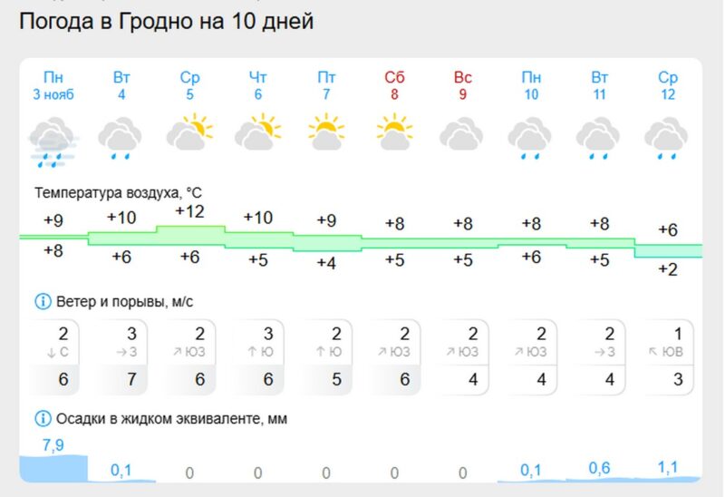 9 ноября (воскресенье) преимущественно без осадков, лишь местами по северу пройдут небольшие кратковременные дожди. Ночью и утром в отдельных районах ожидается туман и слабый гололед. Температура воздуха ночью — ноль — плюс 6 градусов, при прояснениях — минус 1-3 градуса, днем — плюс 6-13 градусов.