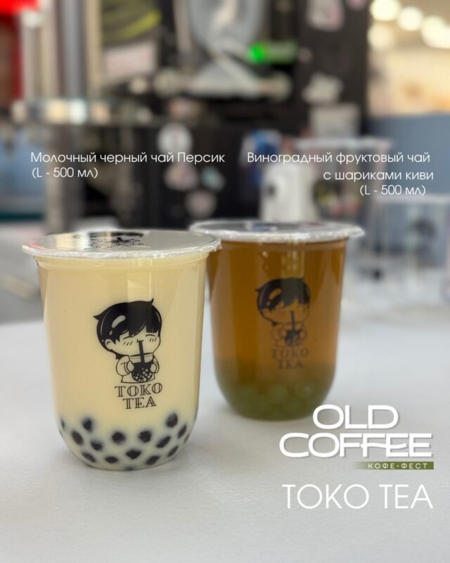 TokoTea: Молочный черный чай Персик (L – 500 мл) и Виноградный фруктовый чай с шариками киви (L – 500 мл)