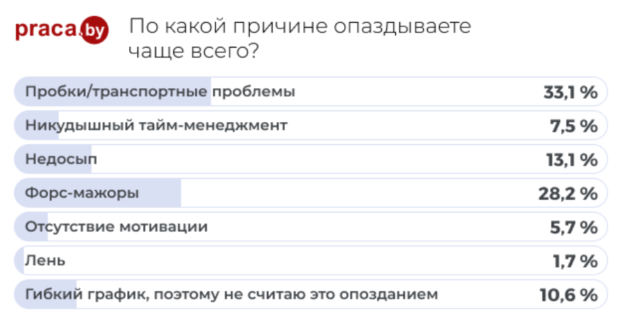 Кстати, чаще всего причиной опозданий сотрудники называют «пробки / транспортные проблемы» (33,1%) и «форс-мажоры» (28,2%).