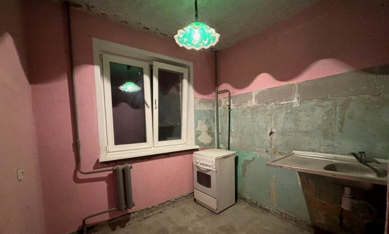 За $38 тыс (около 110 000 рублей) выставлена на продажу «двушка» на Фолюше. Все стандартно для панелек 1960-х годов: шестиметровая кухня, и две жилых комнаты на 14 и 9 «квадратов». Внутри голые стены, но можно сделать ремонт сразу под себя.