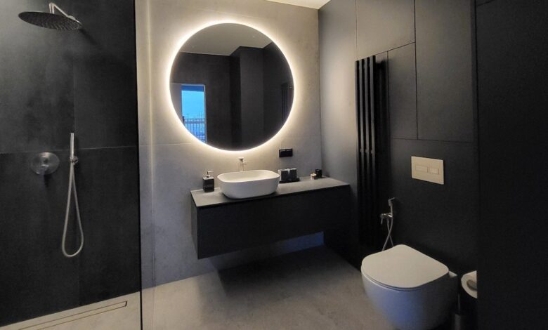 Давней мечтой мужа была ванная комната в черном цвете. «А мечты нужно воплощать», — подумали мы и отправились на поиски той самой плитки, которая бы нас зацепила. Потратив достаточно много времени, мы купили ее в Modus Ceramica. Там же нашли и плитку в сером цвете, «под бетон».