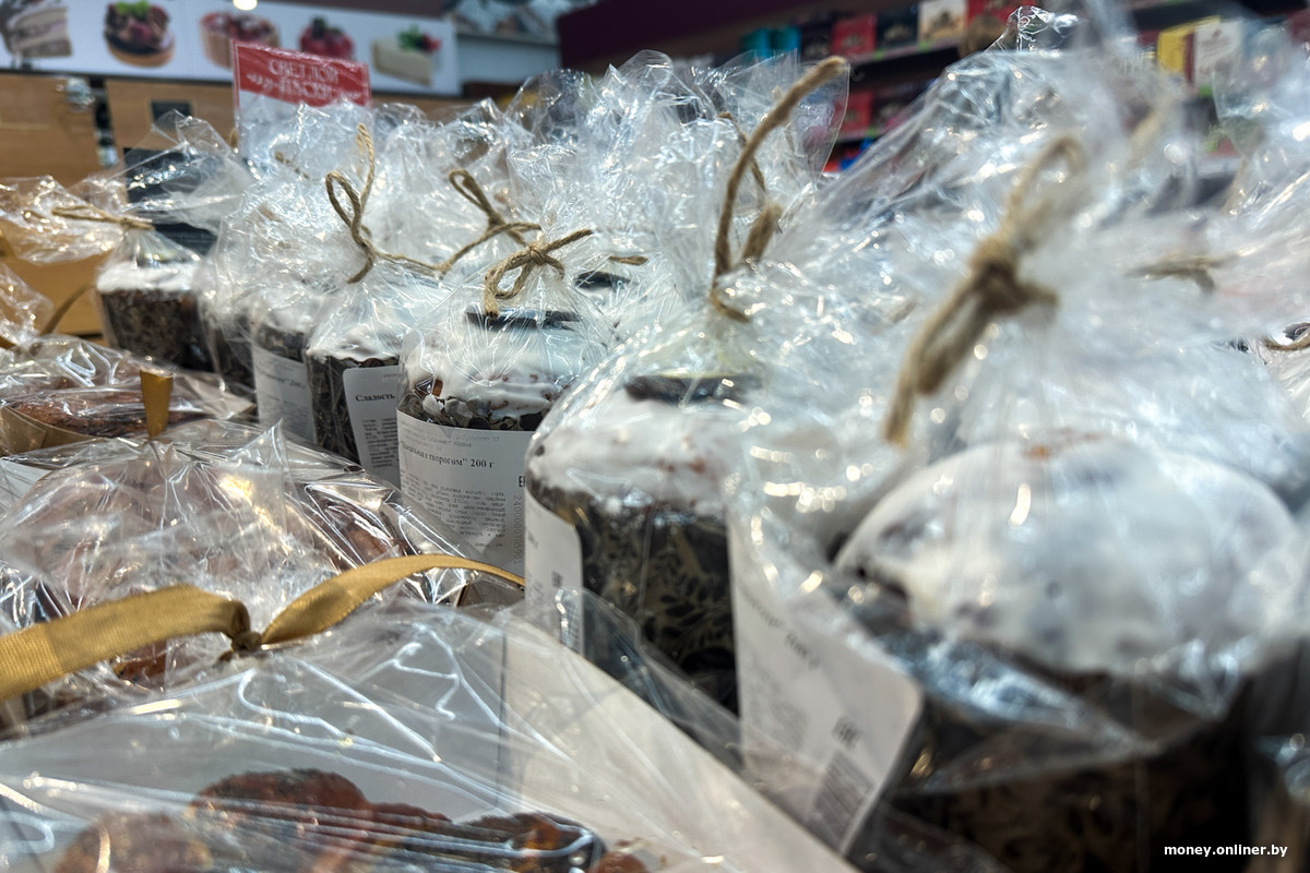 Есть изделия в коробках, например кексы и куличи с орехами, сухофруктами и глазурью, упакованные в подарочный формат с лентами. Их цена — 14,99 рубля за изделие весом порядка 500—550 граммов.