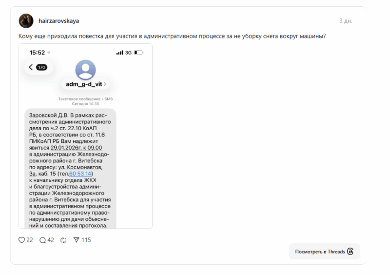 Однако о том, чтобы ЖКХ вызывали нарушителей в исполком и устраивали целый административный процесс для тех, кто не успел вовремя расчистить снег вокруг своей машины и попал на карандаш к коммунальщикам, белорусы рассказывают едва ли не впервые. Девушка из Витебска поделилась в соцсети Threads скрином повестки от ЖКХ, которая пришла ей на телефон. Если верить тексту sms, в отношении неё открыли административное дело по той самой статье 22.10 КоАП и потребовали явиться к определённому времени в районную администрацию, на территории которой было совершено правонарушение.