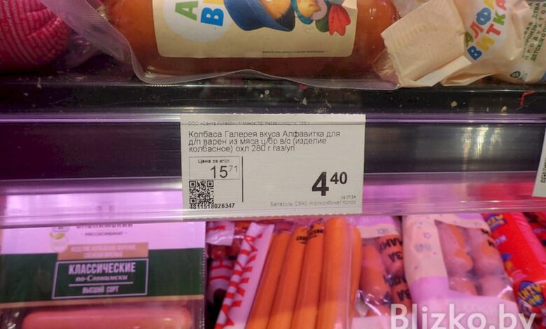 Мы изучили ценники в сетевых магазинах «Евроопт», «Грошык», «Корона», ProStore, «Алми», Green, «Санта», «Соседи», «Родны кут». В «Грошыке» (а точнее, в «Мега Грошыке»), помимо обычных ценников, кое-где используют и гигантские ценники-листовки формата А4 — мы такие не брали, ограничились таким же ценником, как на многих остальных продуктах.