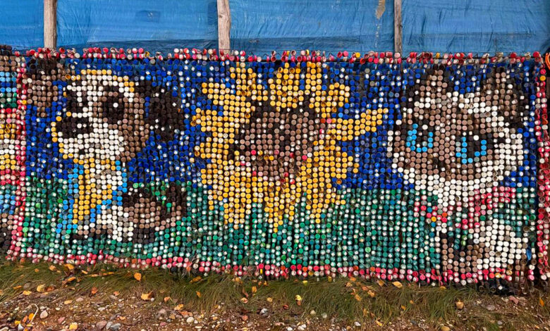 Но вся суть раскрывается, когда подходишь ближе. Ведь материалом для создания изображений и в целом забора послужили пластиковые крышечки!