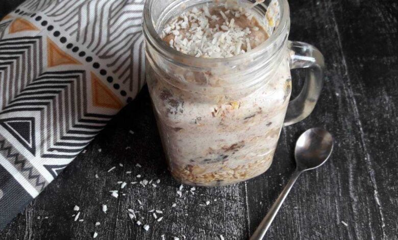 Убрать ленивую овсянку в холодильник минимум на 3–4 часа, а лучше на ночь, чтобы она набухла.