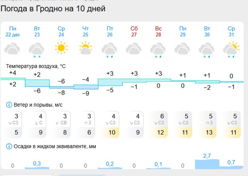 23 декабря в Беларуси ожидается похолодание, сообщили в Республиканском центре по гидрометеорологии, контролю радиоактивного загрязнения и мониторингу окружающей среды Минприроды, передает БЕЛТА.