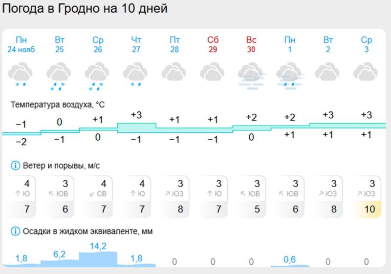 Вместе с тем 25 ноября (вторник) ночные минимумы составят от минус 1 до минус 6 градусов, по югу — от нуля до плюс 1, а днем будет от минус 1 до плюс 5 градусов. 26-27 ноября (среда — четверг) в результате поступления теплого воздуха с юга Европы температурный фон повысится и в ночные часы станет колебаться от слабого минуса до слабого плюса, а в ночь на 27 ноября по юго-востоку минимальные значения температуры воздуха не опустятся ниже 4-7 градусов тепла, дневные максимумы окажутся в пределах от минус 2 до 6 градусов, в юго-восточных районах воздух прогреется до плюс 7-10», — рассказали в Белгидромете.