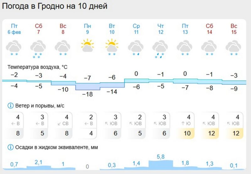 До конца текущей недели на погоду в стране влияют атмосферные фронты и теплые воздушные массы с юга Европы. Поэтому 6–8 февраля температура слегка повысится, но вместе с тем во многих районах Беларуси возможны снег, в том числе мокрый, дождь, метели и гололедные явления.