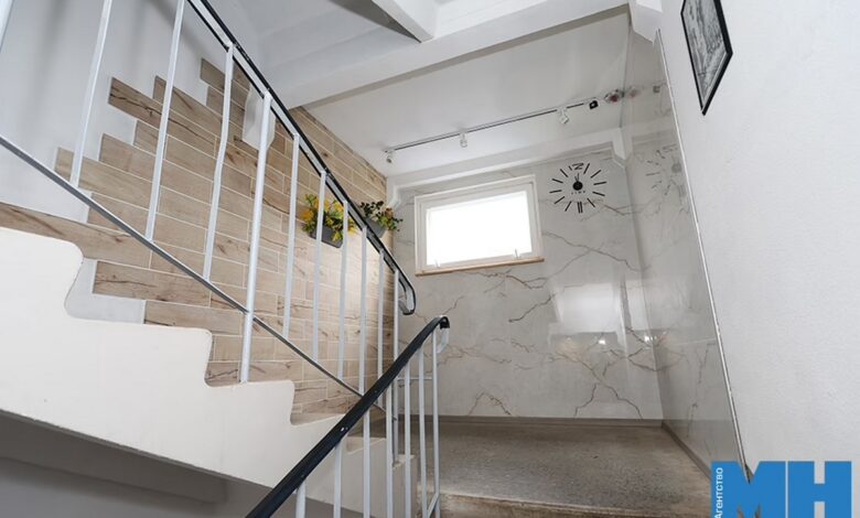 На первом этаже подъезда отдельные стены обложили светло-серым глянцевым керамогранитом большого размера (120 × 60 см), а портал проема, ведущий из холла к лестнице, — матовой мелкоразмерной плиткой в темных тонах. Так же комбинировали облицовку стен на межэтажных площадках. Подоконники заменили на деревянные из цельного полотна, обработав его пропиткой. К потолку закрепили новые трековые светильники. Освежили стены лестничных пролетов — прогрунтовали и перекрасили их в белый цвет. Появились и элементы декора — настенные часы и вазоны с цветами, репродукции картин, фикус в круглой плетеной корзине. Кстати, плетение таких изделий — давнее увлечение Марины.