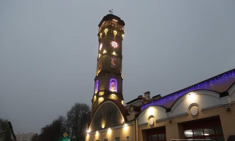 Пожарную каланчу в Гродно украсили огнями и Вифлеемской звездой