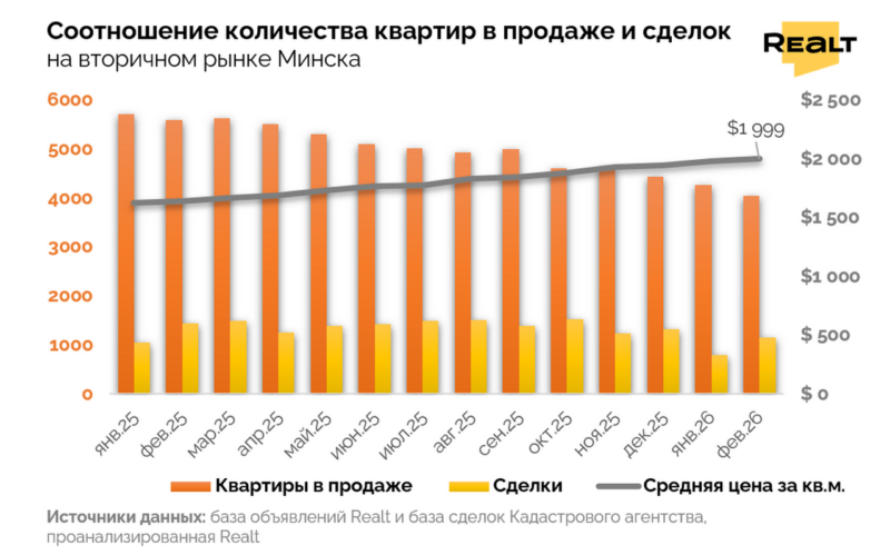 В феврале в Минске продали 1 156 квартир. Это заметно больше, чем в январе (там было всего 800 сделок), но на 300 квартир меньше, чем в феврале прошлого года. А 2025-й, к слову, и без того был не самым удачным по объемам продаж.