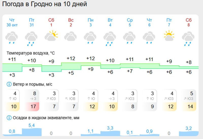 «1-2 ноября (суббота-воскресенье) влияние атмосферных фронтов от заполняющегося циклона ослабнет, фон атмосферного давления начнет расти, в результате чего количество и интенсивность осадков уменьшится и они примут локальный характер. Однако 3-5 ноября (понедельник-среда) очередные фронтальные разделы принесут новые порции осадков, которые будут распределяться неравномерно по территории страны. При этом сохранится теплая погода с ночными минимумами от 0 до 10 градусов и дневными максимумами от плюс 6 до 14 градусов, лишь 2-3 ноября в южных, юго-западных районах страны будет на пару градусов теплее. В ночные и утренние часы во влажном воздухе местами по стране будут отмечаться непродолжительные туманы», — поделились прогнозом в Белгидромете.