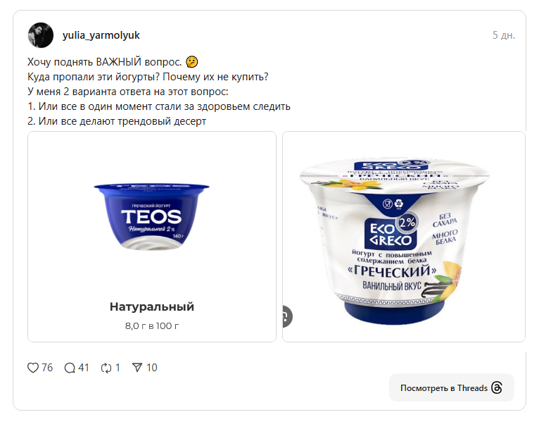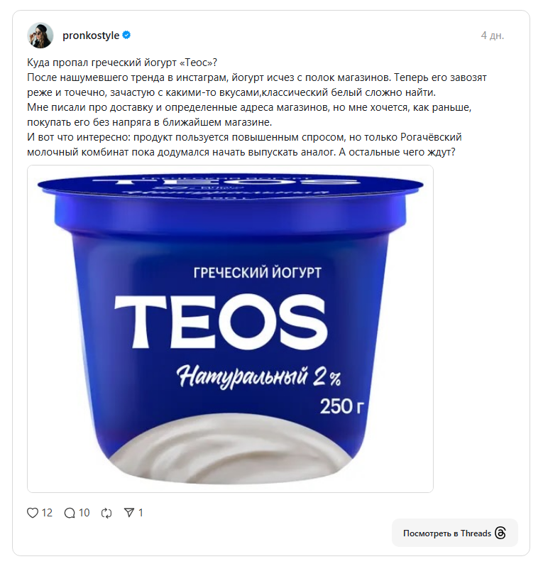 «Куда пропал греческий йогурт „Теос“? После нашумевшего тренда в инстаграм йогурт исчез с полок магазинов. Теперь его завозят реже и точечно, зачастую с какими-то вкусами, классический белый сложно найти. Мне писали про доставку и определенные адреса магазинов, но мне хочется, как раньше, покупать его без напряга в ближайшем магазине», — делятся покупатели.