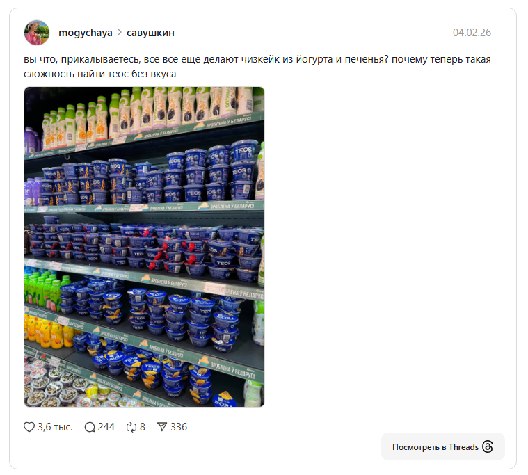 Некоторые читатели отмечают, что проблема не ограничивается одним брендом. С полок исчезли греческие йогурты разных производителей: продукцию «Бабушкиной крынки» сейчас тоже сложно найти, а греческий йогурт Рогачевского молочноконсервного комбината в Минске и раньше появлялся нерегулярно — теперь же его почти не встретить.