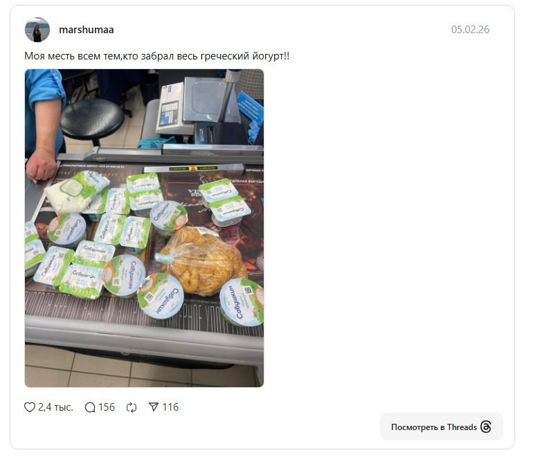 — Похожая ситуация в начале 2025 года была с мягким творогом «Савушкин», за которым охотились зожники по всей стране. Усилил спрос и кулинарный тренд: тысячи и тысячи людей все еще охотятся за йогуртом, чтобы приготовить «ленивый» ПП-чизкейк, рецепт которого завирусился в интернете.