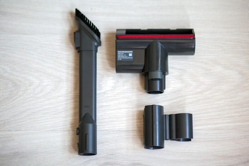 Длинная щелевая насадка со щёткой проникает между шкафами, в узкие щели у батарей, под сиденья автомобиля. А с помощью электрической мини-щётки можно убрать то, что часто остается недоступным для обычных пылесосов — шерсть животных с ковра или кресла, пыль с полок и подоконников.