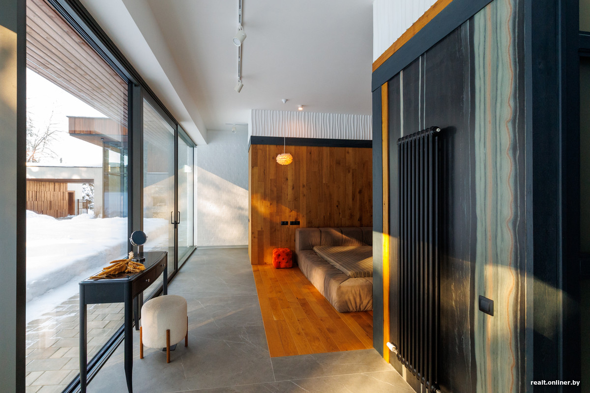 За счет того что в нем всего один этаж, дом не смотрится громоздко. Наоборот, он как будто бы небольшой, спрятан от лишних глаз высоченными деревьями. Конструкция у дома монолитная, стены сделаны из кирпича, а фасады украшены итальянским керамогранитом и доской из дуба. Входную дверь сразу и не обнаружишь — она сливается с фасадом и выдает себя только торчащей ручкой с электрическим замком.