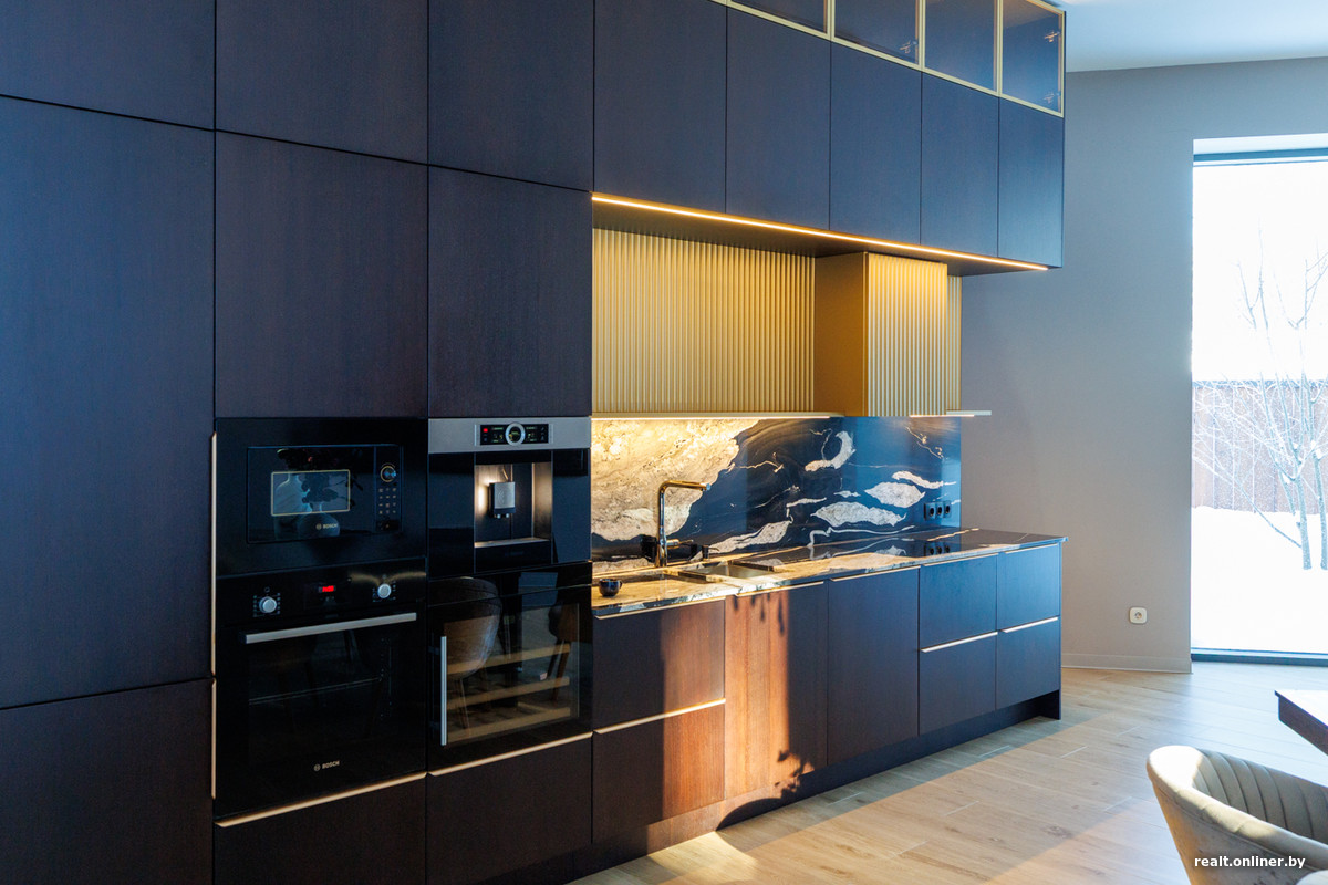 Кухней семья попользоваться не успела — сразу после завершения ремонта было принято решение продать недвижимость. Поэтому итальянская столешница из гранита, венгерские шпонированные фасады и встроенная техника находятся в нетронутом состоянии.